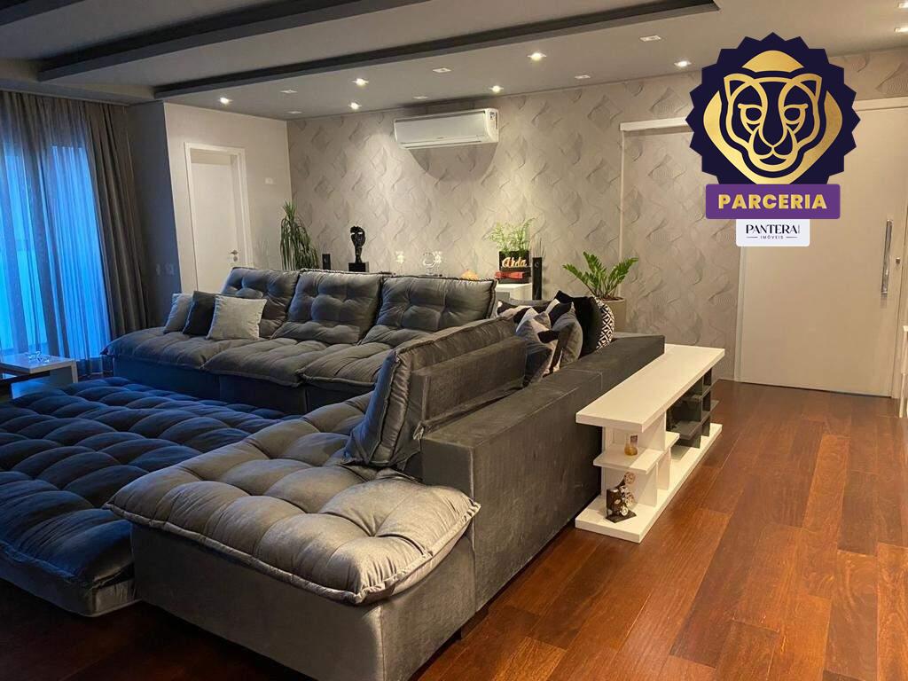 Possui 3 suítes, 3 banheiros, lavabo, sala ampla, varanda gourmet, cozinha planejada, área de serviço, dependência de empregada com banheiro, elevador privativo e 5 vagas de garagem.